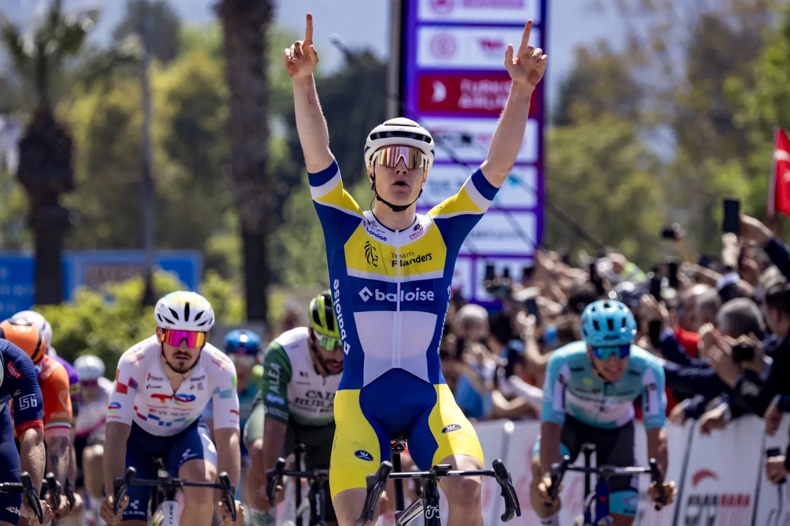 İZMİR (İGFA) - Cumhurbaşkanlığı Türkiye Bisiklet Turu’nun 61. yılında start alan Çeşme–Selçuk etabı büyük heyecana sahne oldu. 154.7 kilometrelik zorlu parkuru Team Flanders-Baloise takımından Tom Crabbe, 3 saat 23 dakika 57 saniyelik derecesiyle kazanarak turkuaz mayonun sahibi oldu.